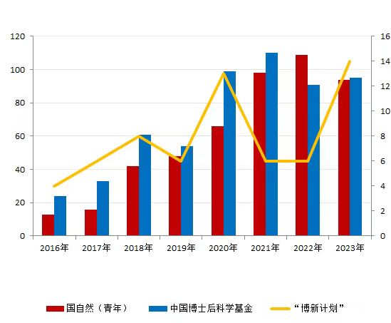 学校全方位支持青年人才申请博士后各类人才计划和基金项目:包括“博士后创新人才支持计划”“国际人才项目”“国家资助博士后研究人员计划”等面向海内外博士毕业生的人才资助计划;中国博士后科学基金、国家自然/社会科学基金、北京市自然科学基金、各省、市级自然科学基金等基金项目。截止2023年,学校累计入选“博士后创新人才支持计划”63人,获批博士后基金(特别、面上)567项,国自然基金(青年)共计496项。